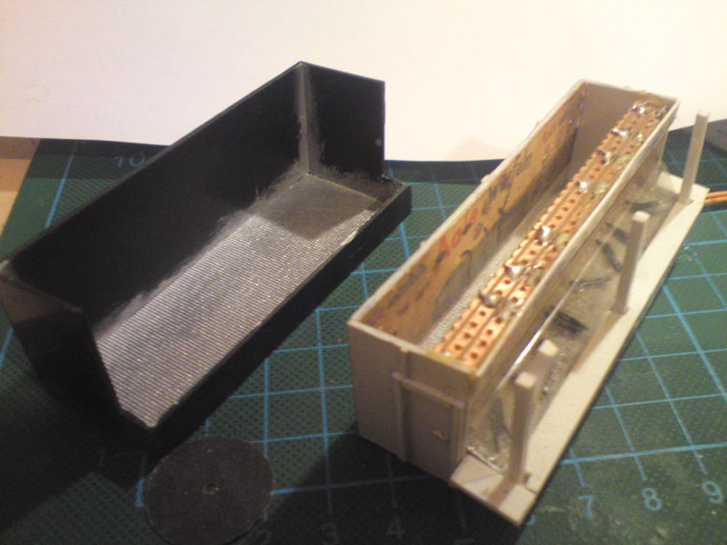 Verwendete Baugröße ist 0805, verbaut sind bis jetzt 170 Stück (leuchtend) Hinzu kommen noch die Windmühlenflügel, sowie die Schilder. Die Front wird später noch von Scheinwerfern beleuchtet, der Innenraum soll mit 2 Warmweißen LEDs ausgestattet werden. An der Dachkante ist leider in einem Segment was schief gegangen, daher werd ich Herrn Preiser, Besitzer der Kartoffelmühle später mit Leiter zum Birnenauswechseln losjagen